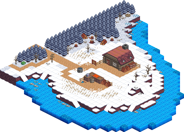 An old, well-built wooden cabin sits on the coast of this snowy peninsula. Its windows emanate a warm light, and from its chimney, white smoke rises into the air. The surrounding air is crisp and cold.
